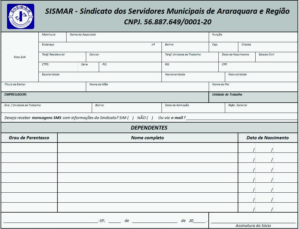 Lista de documentos necessários para ser associado do Sismar e o formulário para impressão. Preencha e traga à sede do sindicato: Rua Gonçalves Dias (1), 970, Centro, Araraquara. Seja bem vindo. Juntos somos mais fortes.