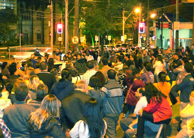 Aproximadamente 500 servidores lotaram a frente da Câmara Municipal de Araraquara ontem, 15, e rejeitaram a contraproposta ridícula da Prefeitura de dar apenas a inflação no salário. A categoria acumula perda em torno de 32% no salário nos últimos 13 anos e o vale-alimentação está congelado desde 2012, período em que a inflação dos alimentos foi superior a 20%.