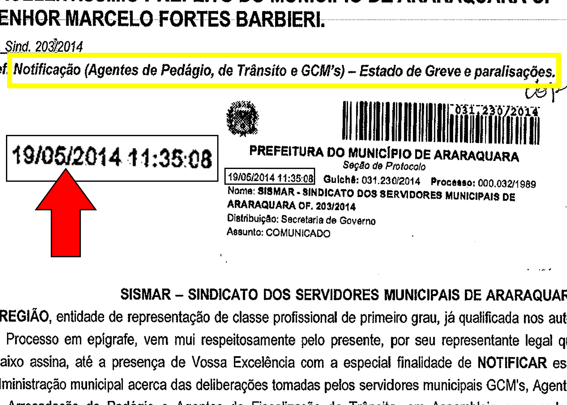 O documento apresentado pelo Sindicato é um ofício protocolado na Prefeitura no dia 19 de maio, 15 dias antes da paralisação, informando ao prefeito Marcelo Barbieri (PMDB) que haveria paralisações dos Agentes de Arrecadação do pedágio de Bueno no dia 22 de maio e dos Agentes de Trânsito e dos Guardas Municipais no dia 3 de junho, caso suas reivindicações não fossem atendidas.